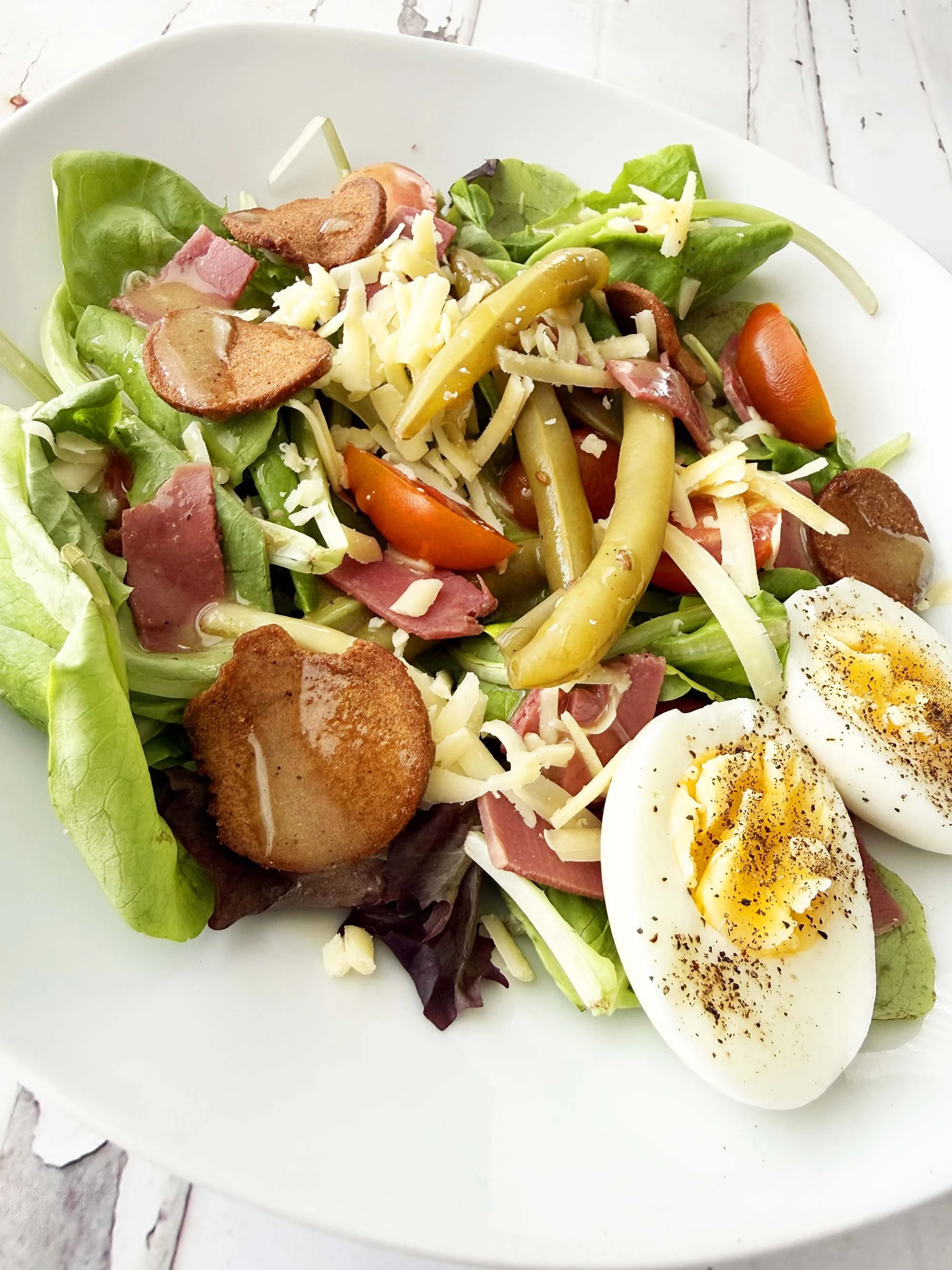 - Top the lettuce with the 5 Oz. Cherry Tomatoes, 8 Oz. Pickled Green Beans, 4 Hard Boiled Eggs, and 1/2 C. Shredded Irish Cheddar divided evenly.