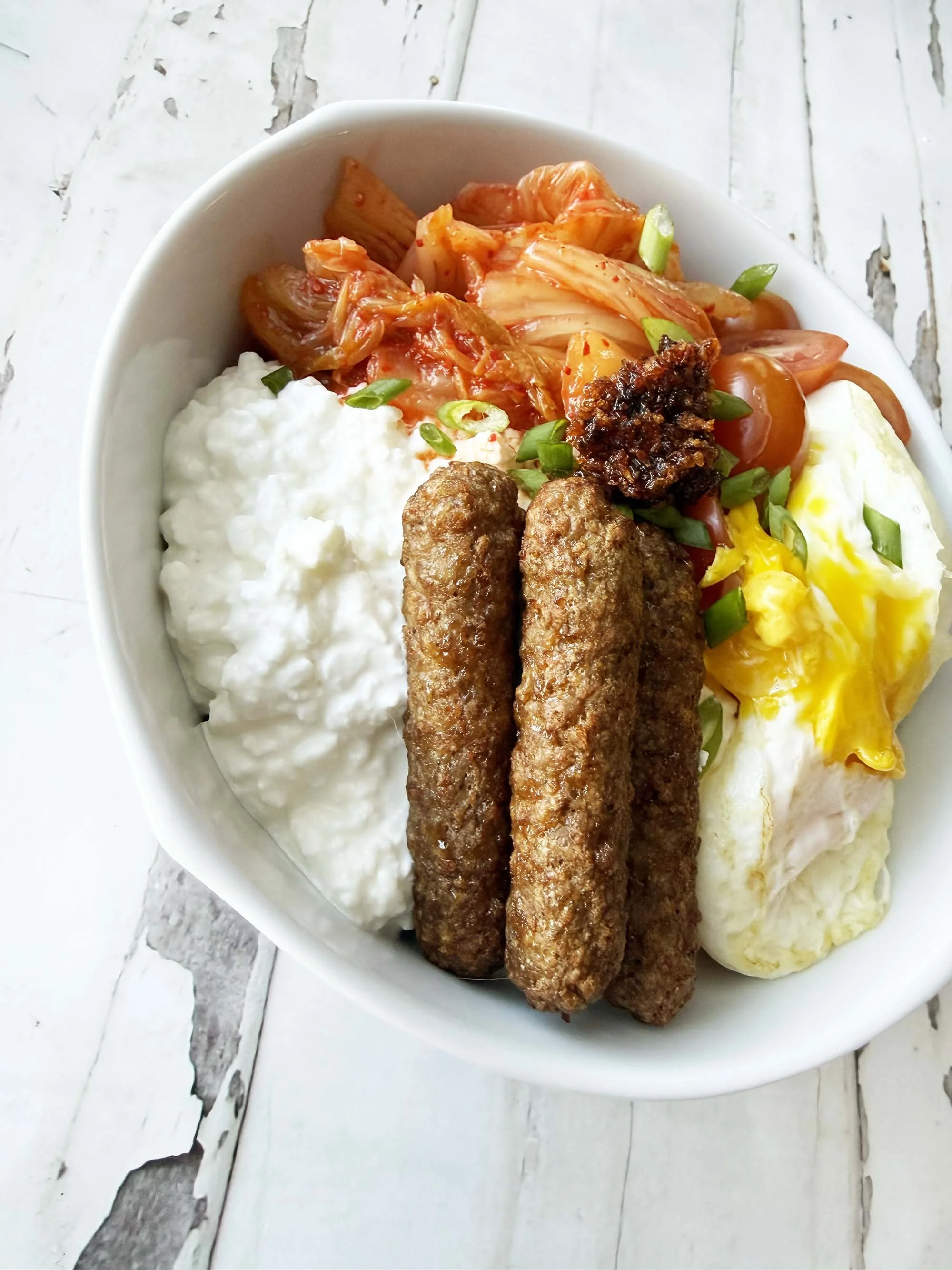 - Fill a bowl with the 1/2 C. Low Fat Cottage Cheese, 1/4 C. Kimchi, 1/4 C. Cherry Tomatoes, 1 Whole Large Egg, 3 Plant Based Breakfast Sausage Links, and 1 Tsp. Garlic Chili Crisp.