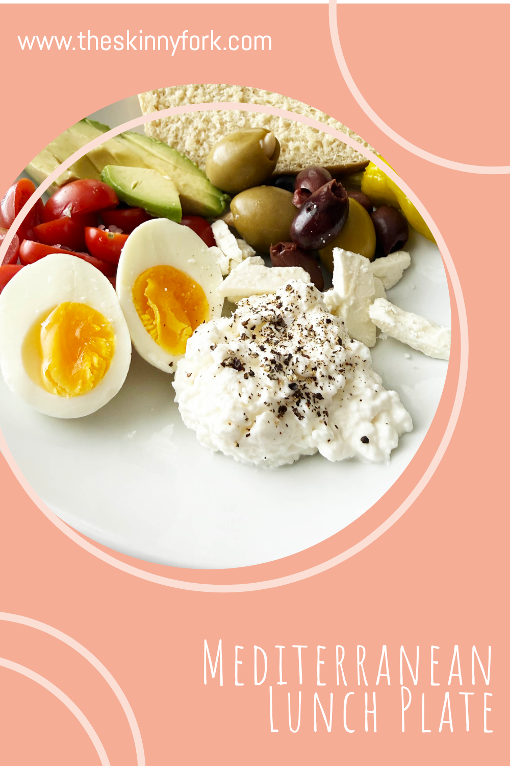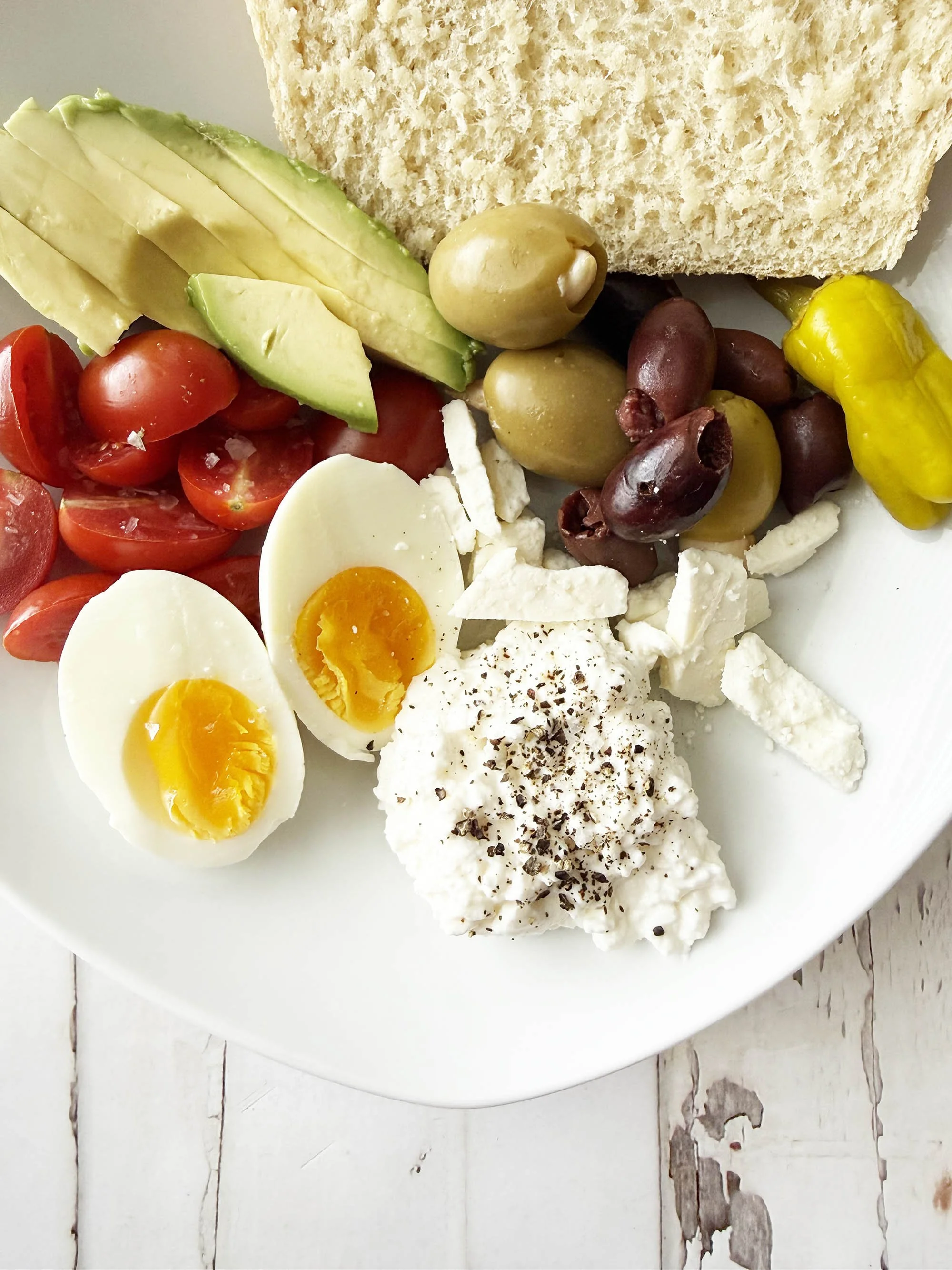 - Arrange the 1 Slice Bread, 1/4 C. Low Fat Cottage Cheese, 1/4 C. Olives, 1/4 C. Fresh Avocado, 1/4 C. Cherry Tomatoes, 1 Whole Large Egg, and Tbsp. Reduced Fat Feta Cheese on a plate together.